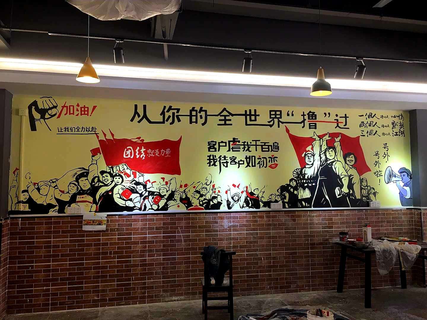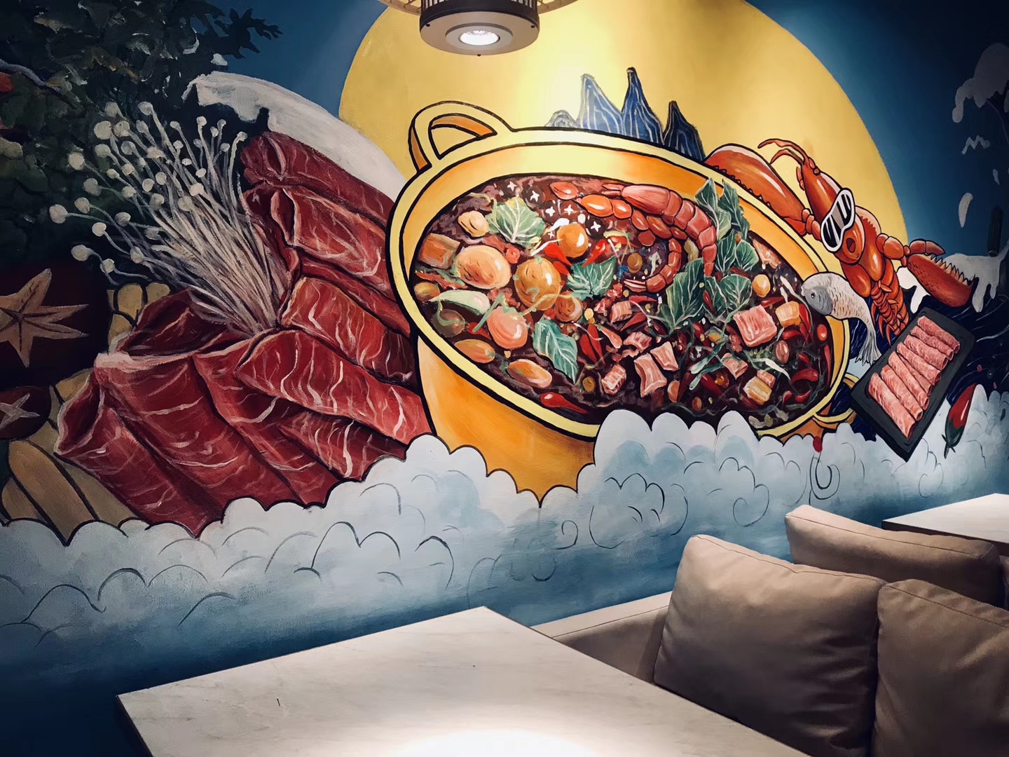 这些年来,广泛普及到墙绘涂鸦领域的餐厅店铺有:火锅店、香锅店、烧烤店、烤鱼店、麻辣串串店、牛杂煲店、龙虾店、海鲜店、寿司店、湘菜馆等。
